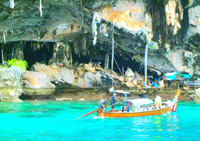 | 09.30 น. | นำท่านเที่ยวรอบเกาะพีพีเล เกาะหินปูนที่มีความงดงามติดอันดับโลก และสนุกสนานไปกับการดำผิวน้ำดูปะการังและฝูงปลามากมาย อ่าวมาหยา สถานที่อันเลื่องชื่อ ที่ถ่ายทำภาพยนตร์เรื่อง "The Beach" เป็นอ่าวที่มีหาดทรายขาวละเอียด น้ำทะเลใสสะอาด เหมาะแก่การเล่นน้ำ และถ่ายรูปเป็นที่ระลึกอย่างยิ่ง อ่าวโล๊ะซามะ จุดดำน้ำดูปะการังที่สวยงาม ณ จุดนี้ท่านจะได้ชมฝูงปลาน้อย-ใหญ่หลากหลายชนิด และดอกไม้ทะเลที่งดงามเป็นจำนวนมาก อ่าวปิเละ ชมทะเลใน (Lagoon) และท่านจะได้พบกับน้ำทะเลสีเขียวมรกต ที่ถูกโอบล้อมด้วยผาหินปูนอันสูงชันงดงามตระการตา ถ้ำไวกิ้ง ชมความงามของถ้ำ ซึ่งเป็นสถานที่ทำรังของนกนางแอ่นจำนวนมาก |