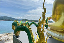นมัสการพระประธาน สีทองสุกปลั่ง ผันหน้าออกอะเลอันดามัน พญานาค 2 ตัว คอยเฝ้ารักษา และดูแล การเดินชมรอบเกาะ จนบรรจบมา ยังริมหาดของวัด Temple Beach ใช้เวลา 1 ชั่วโมง (รวมทั้งเวลาหยุด ตามจุดที่สนใจแล้ว) เป็นกิจกรรมที่ยอดเยี่ยม สร้างความสดชื่น แบบ Simple the best อย่างแท้จริง